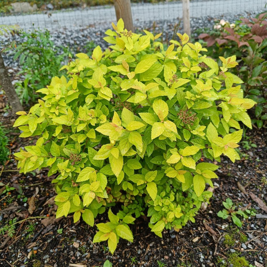 Angervo, jonka lehdet ovat raikkaan kellertävät. Kiva väripläjäys puutarhaan!