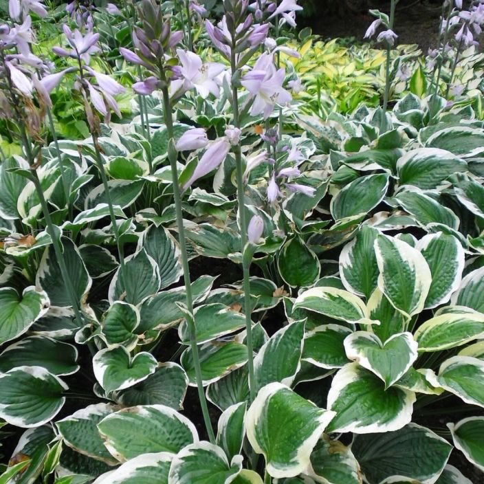 Suurilehtinen kuunlilja, jonka lehdet ovat vihreän- ja valkoisenkirjavat.