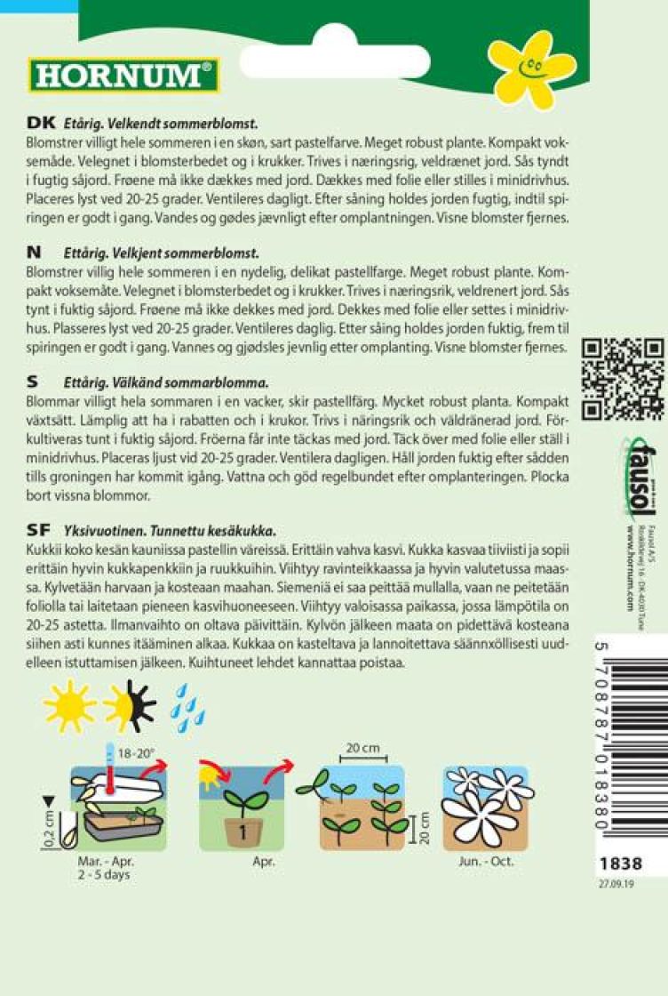 Kukkii koko kesän kauniissa pastellin väreissä. Erittäin vahva kasvi. Kukka kasvaa tiiviisti ja sopii erittäin hyvin kukkapenkkiin ja ruukkuihin. Viihtyy ravinteikkaassa ja hyvin valutetussa maassa. Kylvetään harvaan ja kosteaan maahan. Siemeniä ei saa peittää mullalla, vaan ne peitetään foliolla tai laitetaan pieneen kasvihuoneeseen. Viihtyy valoisassa paikassa, jossa lämpötila on 20-25 astetta. Ilmanvaihto on oltava päivittäin. Kylvön jälkeen maata on pidettävä kosteana siihen asti kunnes itääminen alkaa. Kukkaa on kasteltava ja lannoitettava säännxöllisesti uudelleen istuttamisen jälkeen. Kuihtuneet lehdet kannattaa poistaa.