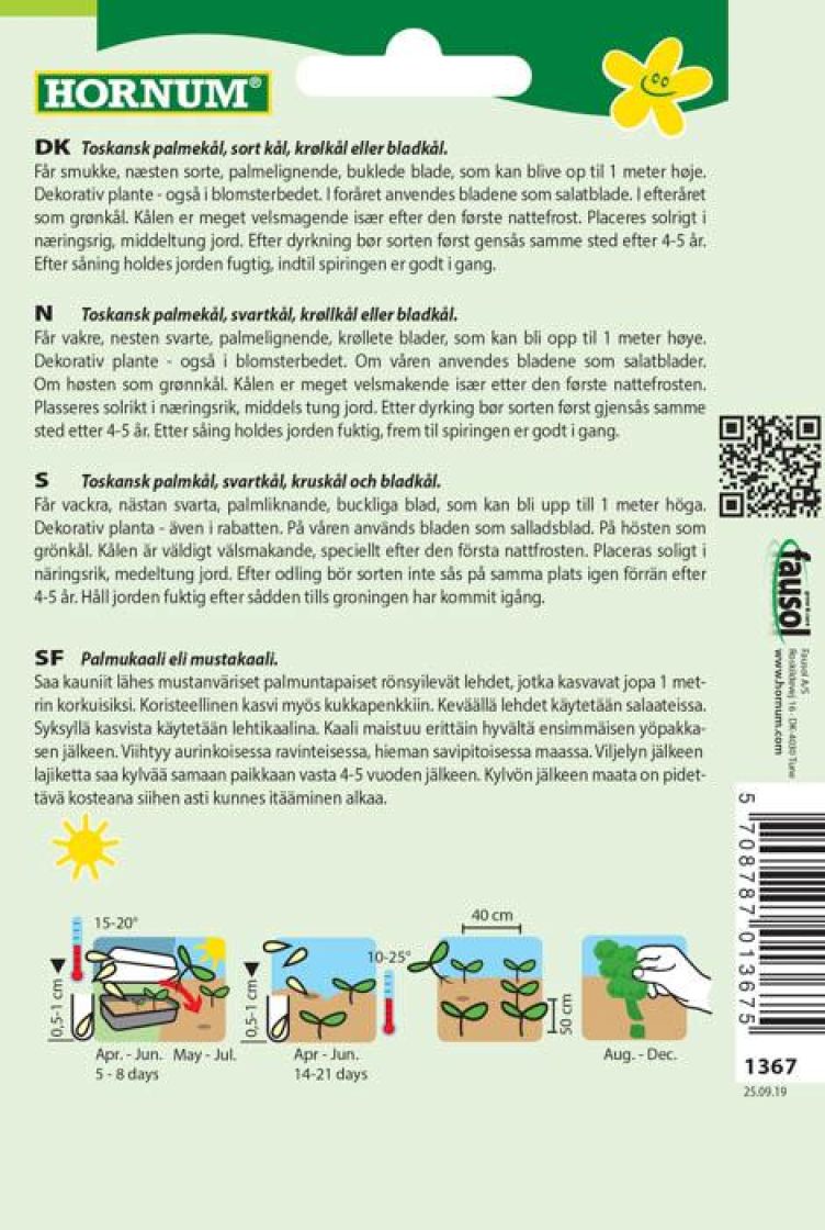 Saa kauniit lähes mustanväriset palmuntapaiset rönsyilevät lehdet, jotka kasvavat jopa 1 metrin korkuisiksi. Koristeellinen kasvi myös kukkapenkkiin. Keväällä lehdet käytetään salaateissa. Syksyllä kasvista käytetään lehtikaalina. Kaali maistuu erittäin hyvältä ensimmäisen yöpakkasen jälkeen. Viihtyy aurinkoisessa ravinteisessa, hieman savipitoisessa maassa. Viljelyn jälkeen lajiketta saa kylvää samaan paikkaan vasta 4-5 vuoden jälkeen. Kylvön jälkeen maata on pidettävä kosteana siihen asti kunnes itääminen alkaa.