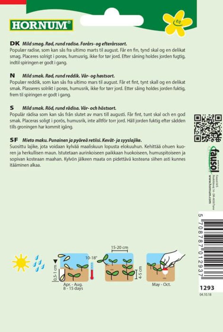 Mieto maku. Punainen ja pyöreä retiisi. Kevät- ja syyslajike.