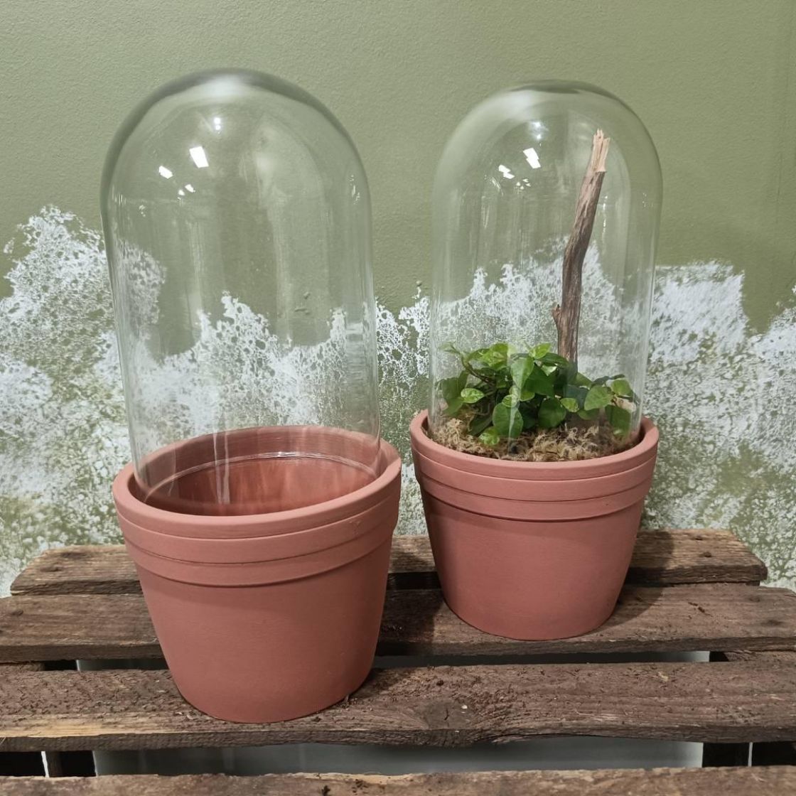 Sisältä lasitettu, umpinainen terracotta-ruukku, jossa umpinainen lasikupu. Kupu asettuu ruukun sisäreunassa olevalle reunakkeelle.