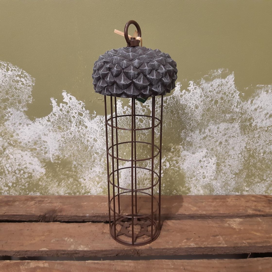 Tammenterhoa imitoiva kansi ja ruskeaksi maalattu tilava ritelikkö.